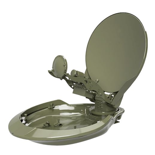 The PDA-100MIL is a compact and sophisticated design for Military Communications. The aerodynamic design of PDA-100MIL provides wind load resistance due to its highly durable zero-backlash elevation over azimuth and polarisation motorized chassis.
